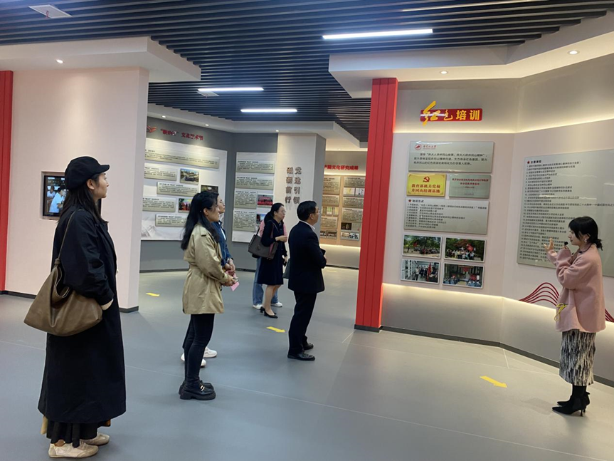 交流会后,井冈山大学 色色视频 办公室主任曾楚乔带领大家参观了井冈山大学自建的“红色基因传承示范基地”,此基地致力于打造全国红色基因传承高端平台。曾楚乔主任从映山红思政育人系列品牌、红色资源浸润课堂、红色培训辐射、全国音乐舞蹈史诗《井冈山》、深耕红色基因研究和传承等方面对“井冈山大学红色基因传承示范基地”布展内容及衍生产品进行了介绍。