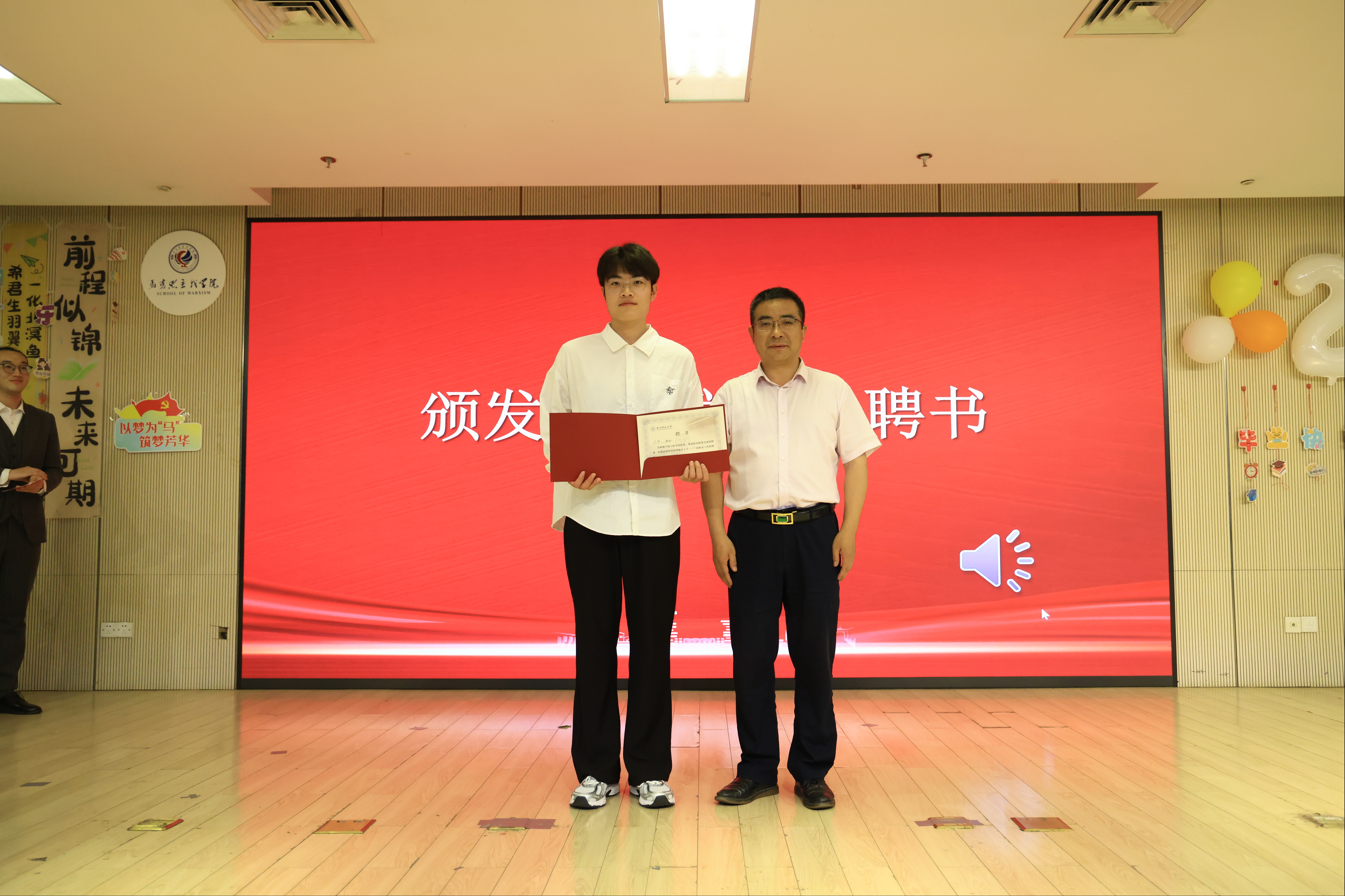 晚会接近尾声,胡祎赟老师为毕业生冯潮同学颁发校友联络员聘书。无论未来走得多远,马院永远是你们坚强的后盾,期待你们带着马院的精神继续前行,一马当先。