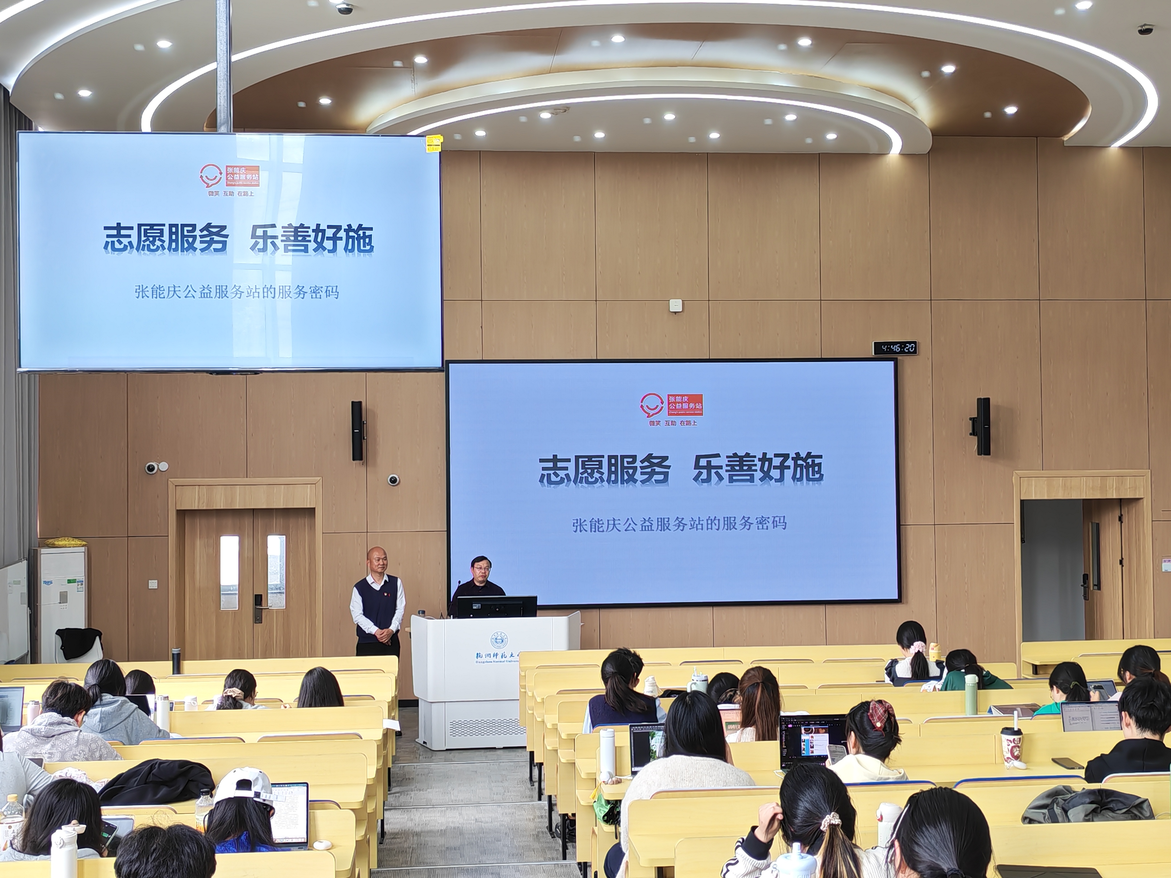 张能庆老师以“浙江省志愿服务专家成员”身份登上 色色视频 讲台,通过情景还原、照片再现、互动交流等形式,从“我和我的公益之路”“党建引领公益,公益促进党建”“张能庆公益服务站的党建菜单”三个部分分享了自己的志愿服务生涯,解码新时代青年的使命担当。