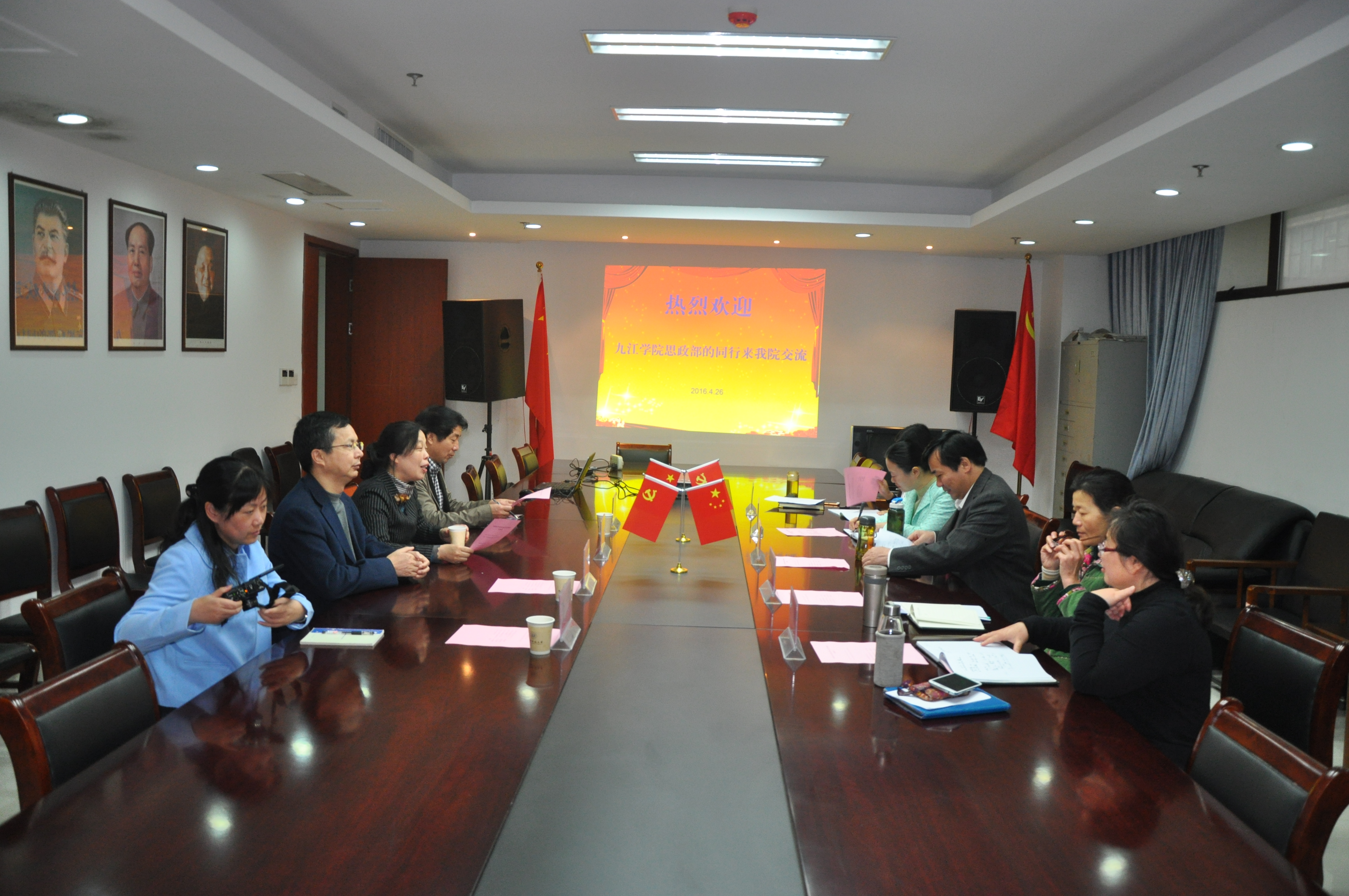 4月26日上午,九江学院思政部主任汪力平教授带领骨干教师一行4人来 色色视频 学习交流。 色色视频 执行院长兼党总支书记余龙进、副院长何丽君、中国近现代史纲要教研室主任张帆、形势与政策教研室主任徐敏、综合办公室主任陈存伟、教务科科长梅慧英出席了接待并与之座谈,座谈会在仓前校区恕园1号楼306会议室进行。