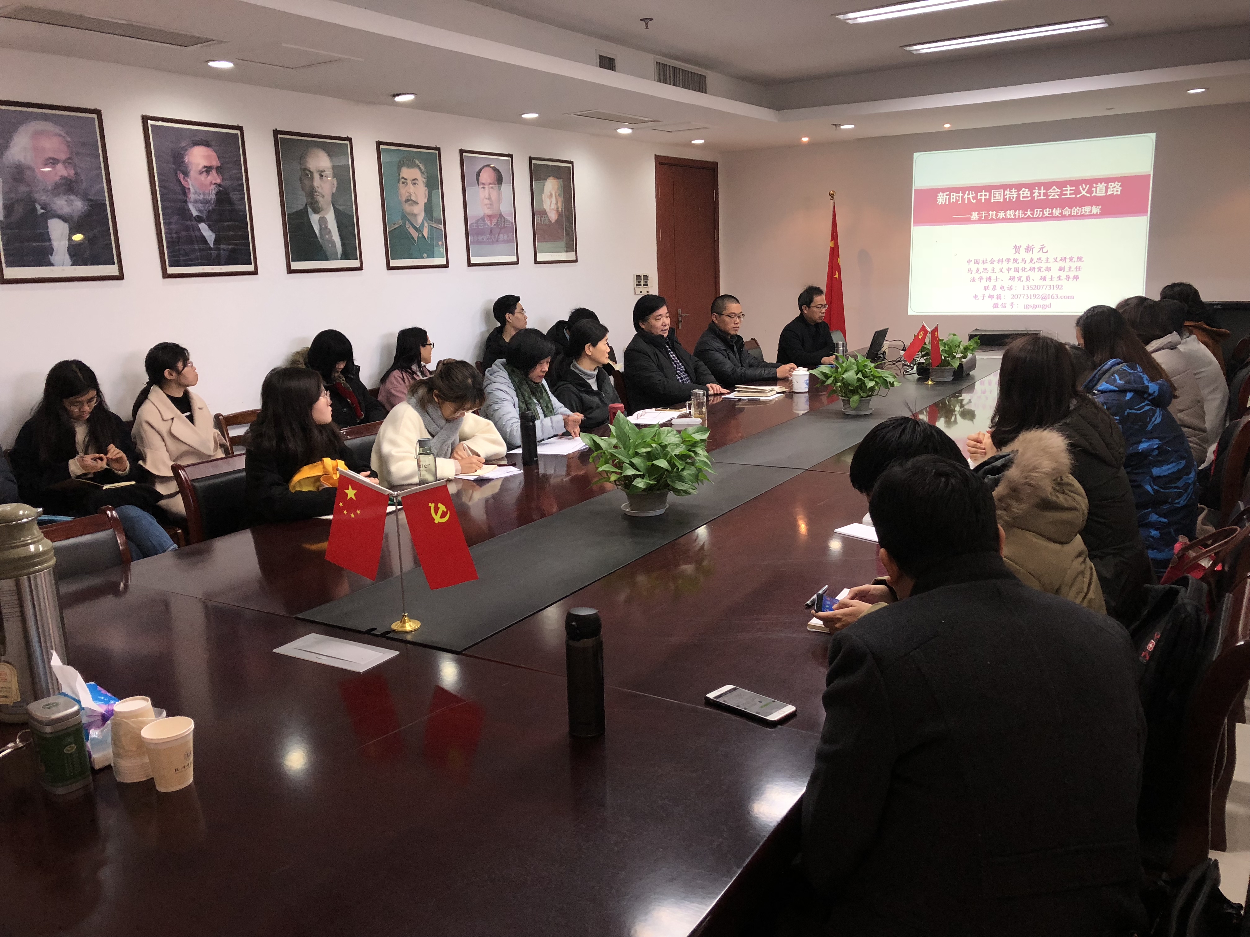 12月18日上午,中国社会科学院马克思主义研究院马克思主义中国化研究部副主任贺新元教授应邀来 色色视频 作题为“新时代中国特色社会主义道路---基于其承载伟大历史使命的理解”的学术报告。本次报告会由色色视频 院长余龙进教授主持,副院长何丽君、学院部分教师、全体研究生及 色色视频 学生习近平新时代中国特色社会主义思想研究会成员参加了报告会。