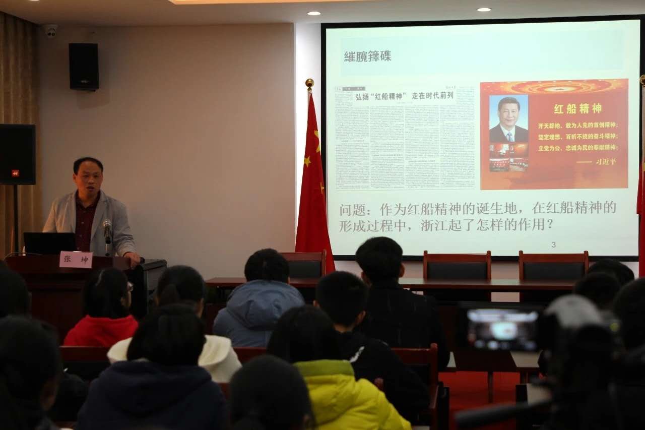 在随后的《中国近现代史纲要》思政课课堂上, 色色视频 教师青年张坤博士结合习近平总书记重要讲话精神,根据因地制宜、因时制宜、因材施教的原则,专门在党史馆开讲了第一堂思想政治理论课——《红船精神与建党时期的浙籍共产党员》,他以介绍建党时期浙籍共产党员(如陈望道、俞秀松、宣中华、施存统等)为基础,围绕浙江在红船精神形成中的巨大作用,号召在座的学生青年们把爱国情、强国志、报国行自觉融入坚持和发展中国特色社会主义事业、建设社会主义现代化强国、实现中华民族伟大复兴的奋斗之中。