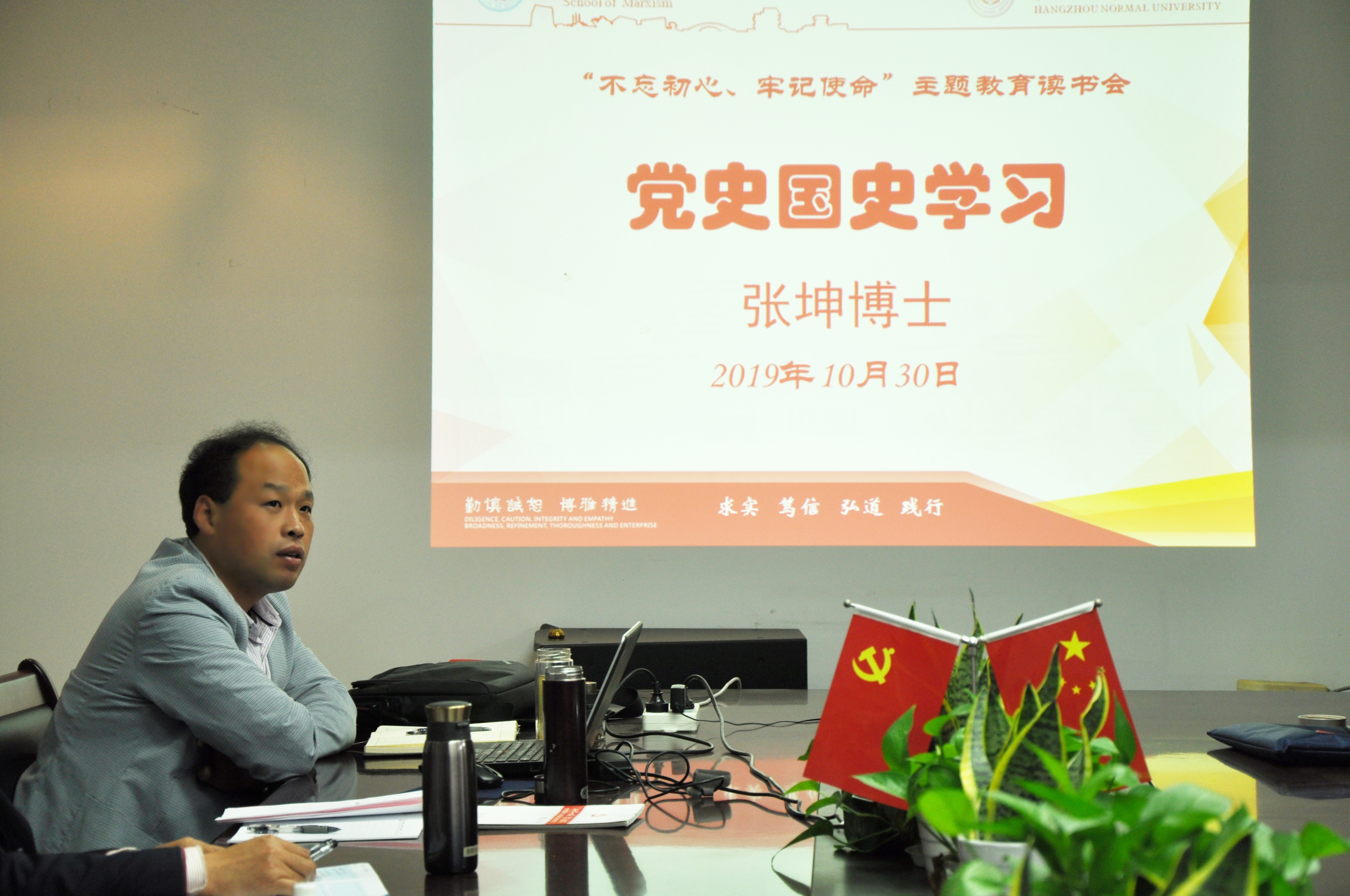 10月30日下午, 色色视频 党总支开展“不忘初心、牢记使命”主题教育读书会,组织全体党员集中学习中国共产党历史和中华人民共和共国史,学院全体32名党员参加,读书会由学院教工第二党支部书记、纲要教研室主任张坤博士作主要发言,学院党总支书记、院长余龙进主持并讲话。
