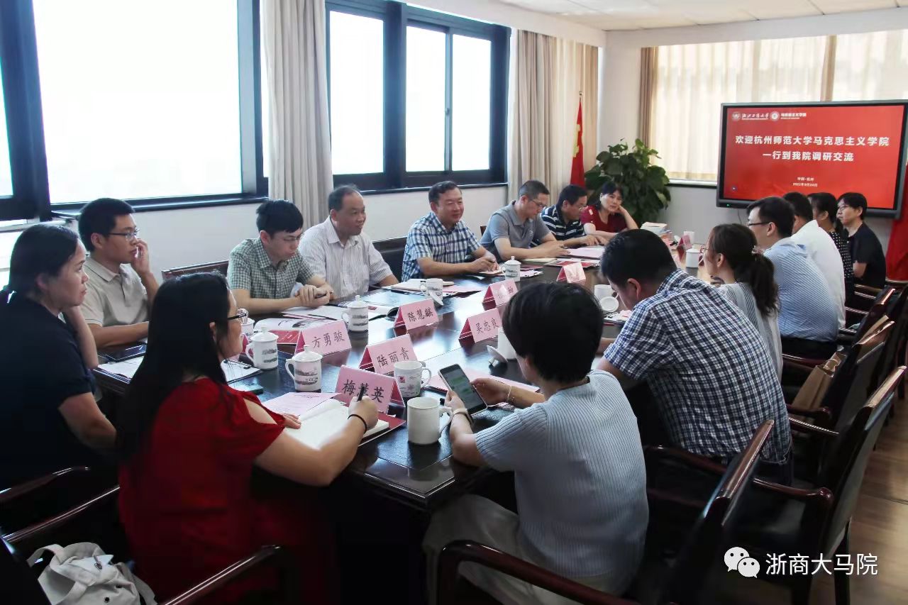 为进一步增强学校之间的沟通交流,学习借鉴其他高校在 色色视频 建设和思想政治理论课教学改革等方面的先进经验,9月24日,在院长、党委书记李洪波带领下, 色色视频 一行9人赴浙江工商大学调研、交流,学院党委副书记应维华,副院长张坤参加调研活动,教研室主任、综合办、教务办均派人参加。