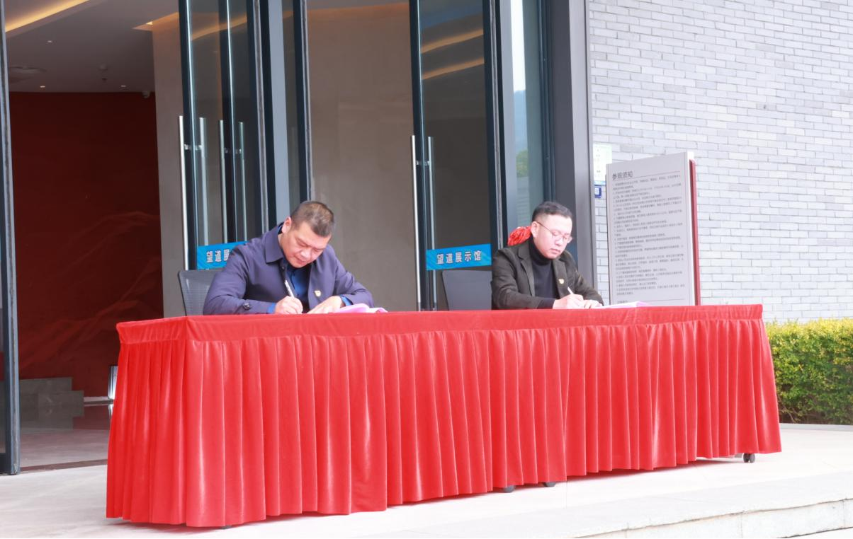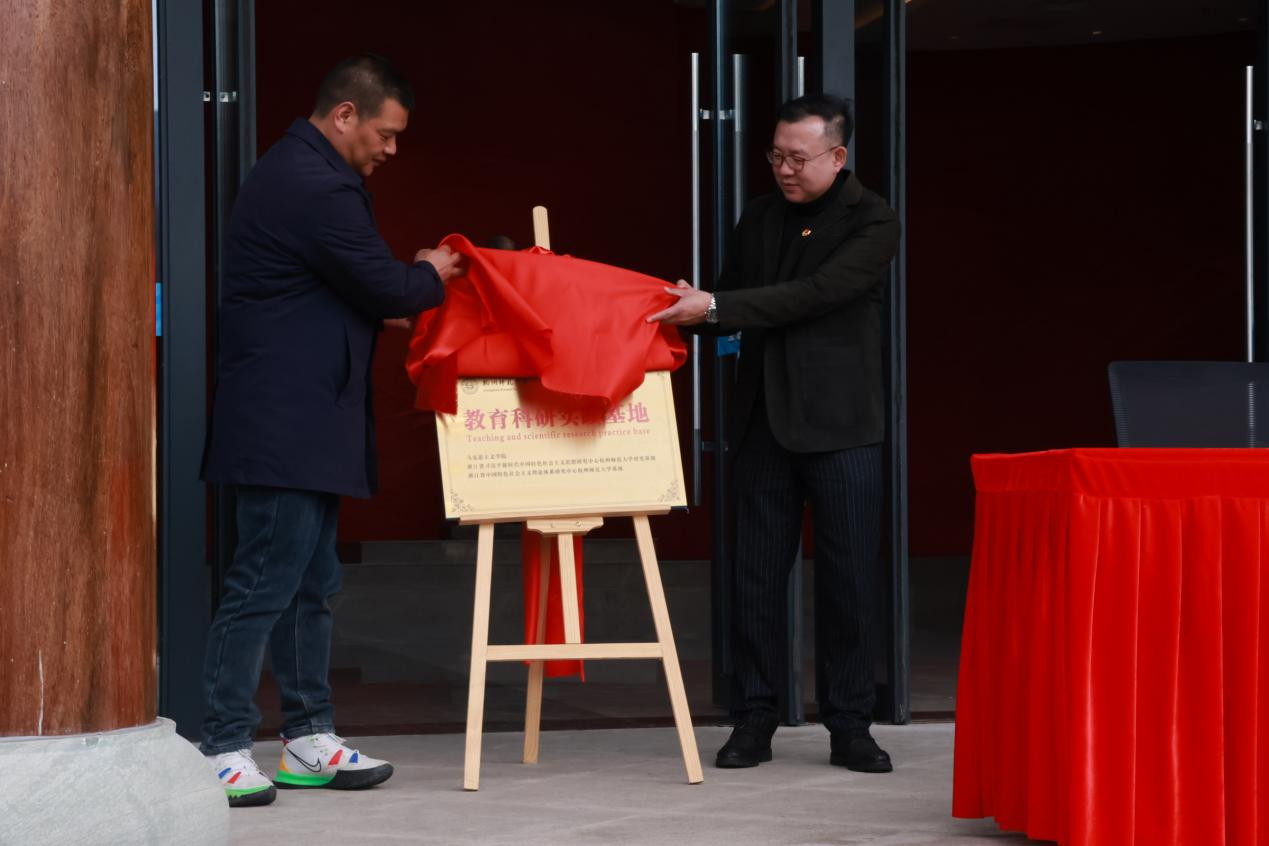 在参观望道展示馆前, 色色视频 与分水塘村举行了隆重的实践基地签约挂牌仪式, 色色视频 党委书记、院长李洪波,党委委员、副院长龚上华,与义乌市分水塘村党支部书记张跃林、义乌市分水塘村青年委员陈卫强进行现场签约和双基地(“教育科研实践基地”“大中小思政教育一体化基地”)揭牌仪式。
