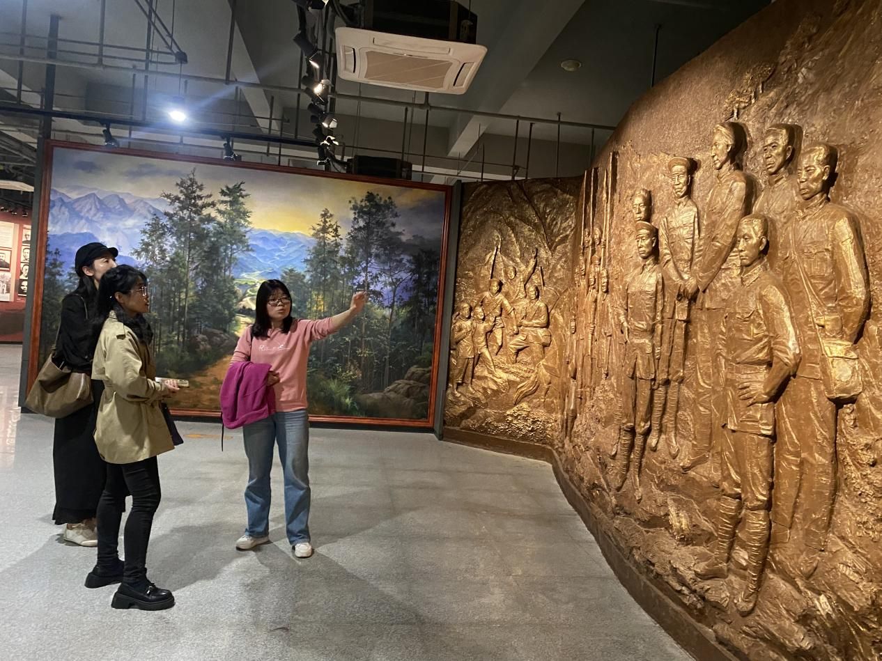 交流会后,井冈山大学 色色视频 办公室主任曾楚乔带领大家参观了井冈山大学自建的“红色基因传承示范基地”,此基地致力于打造全国红色基因传承高端平台。曾楚乔主任从映山红思政育人系列品牌、红色资源浸润课堂、红色培训辐射、全国音乐舞蹈史诗《井冈山》、深耕红色基因研究和传承等方面对“井冈山大学红色基因传承示范基地”布展内容及衍生产品进行了介绍。