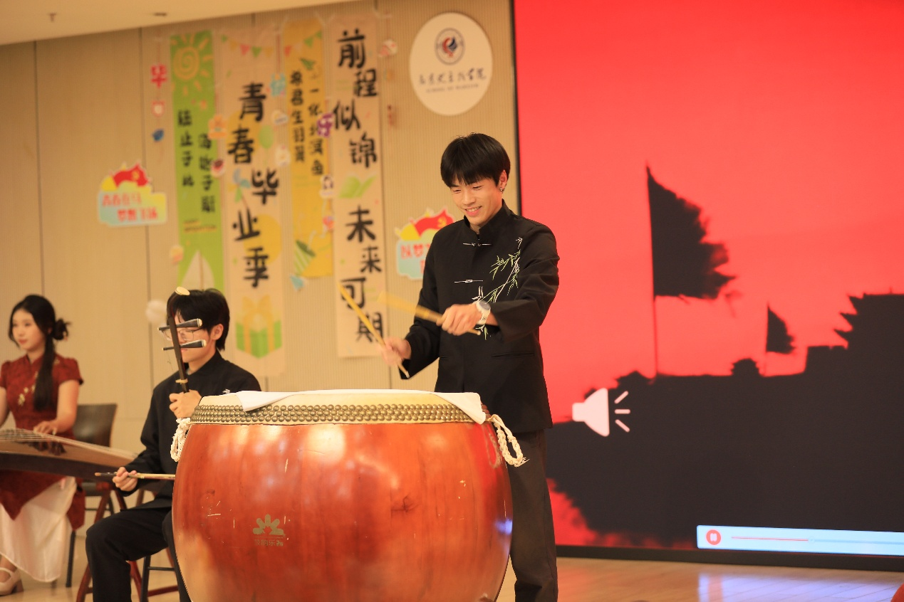 张梓豪同学的古琴表演《阳关三叠》,以古朴典雅的曲调传递出“劝君更尽一杯酒,西出阳关无故人”的惜别之情,传统艺术与毕业主题的交融,为晚会增添了一抹厚重的文化底蕴。