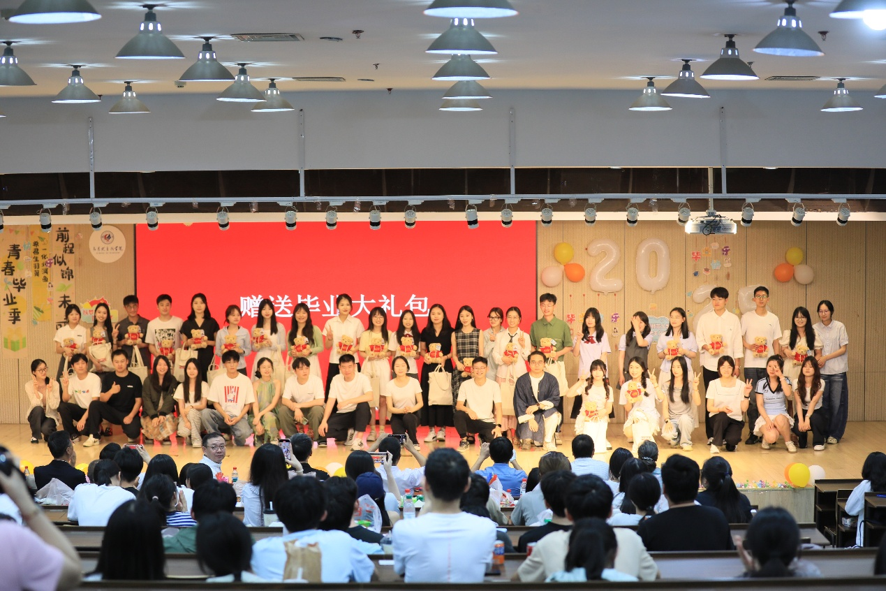 晚会特别设置了游戏互动与抽奖环节,师生们积极参与,现场笑声不断。学弟学妹们通过短视频送上真挚祝福,一句句“毕业快乐”“前程似锦”饱含着对学长学姐的不舍,愿这份来自马院的温暖陪伴他们踏上新的征程。晚会结束后,马院领导、老师与毕业生们合影留念。镜头前,灿烂的笑容与闪烁的泪光交织,定格下这一充满温情与感动的瞬间。