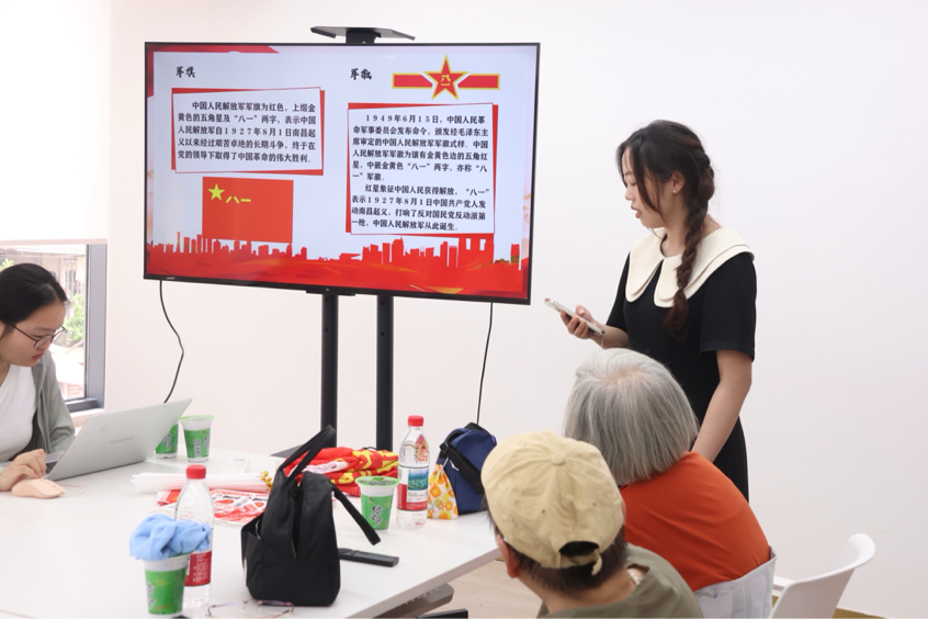 银发老人们在《南昌起义》的短片讲解中追忆红色足迹。当主持人抛出“八一代表什么”的互动问题时,老人们热情地分享自己的见解,用饱经岁月的声音讲述着对军人的深切敬意。在防暑妙招学习区,老年学员们认真练习冲手腕降温技巧,仔细地阅读防暑指南。后续红歌联唱环节更是将活动推向高潮。当《歌唱祖国》的旋律响起,全场参与者们挥舞国旗齐声合唱,嘹亮的歌声在活动室回荡。最后,在致敬合影环节,老人们举着国旗,用最灿烂的笑容向军人致敬。