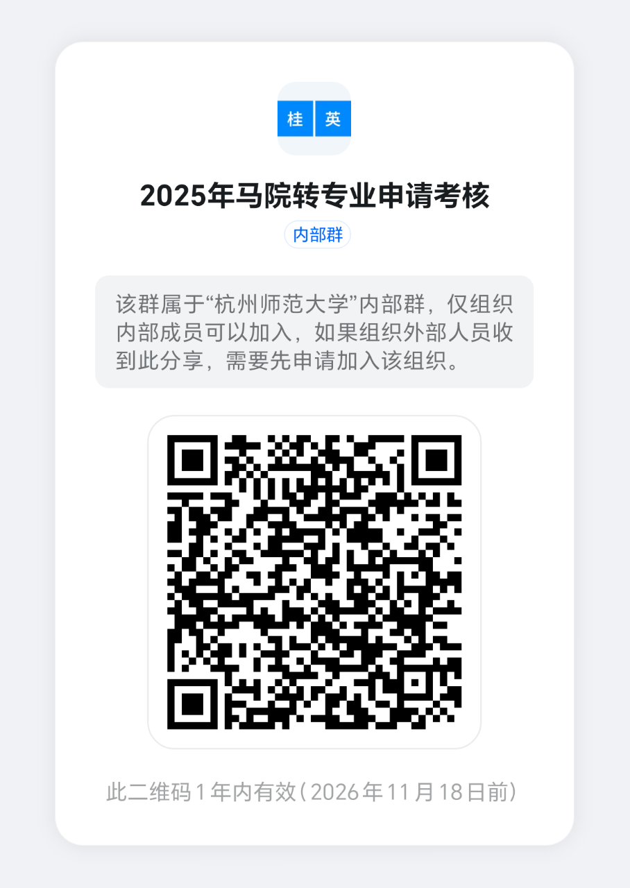 各位同学,根据学校2025年转专业的总体安排,结合学院实际,请拟申请转专业学生根据以下 色色视频 转专业考核方案及考核安排来操作。报名需提交转专业申请表纸质材料,提交地点:下沙校区行政楼212,仓前校区恕园26-304。系统报名成功的学生请加入马院转专业通知钉钉群,二维码: